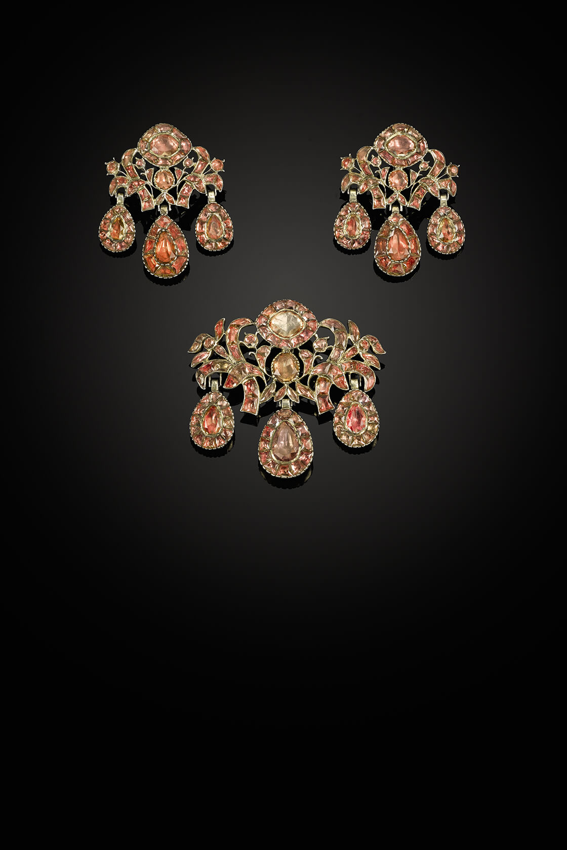 Falamos, assim, de uma coleção composta por anéis, brincos, botões, insígnias, pendentes, colares, adornos de cabelo, pregadeiras, entre outros, ornamentadas, em larga medida, com pedras como granadas, topázios (muito apreciadas em Portugal) e crisoberilos – com a nota de que estes últimos eram muito utilizados, numa altura em que os diamantes com mais de 7 quilates se destinavam ao rei.