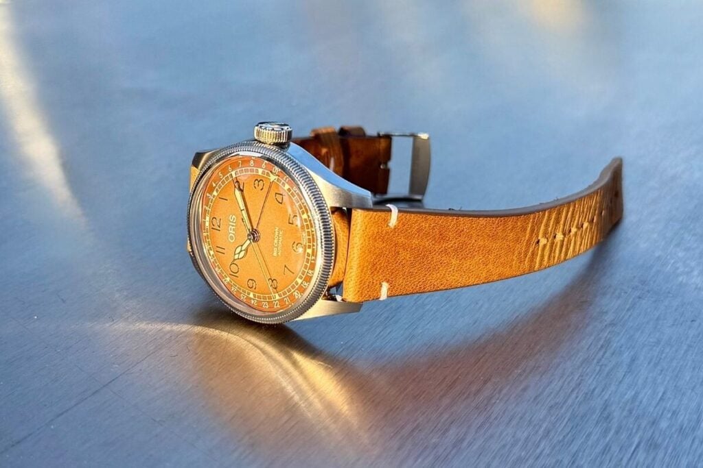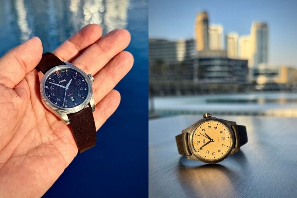 Numa nota adicional, até porque se trata do ex-libris da Oris e o modelo que liga historicamente a marca à aviação, houve uma edição especial do Big Crown Pointer Date apresentada também na Dubai Watch Week — uma edição limitada Seddiqi com correia de pele Cervo Volante e um mostrador gradiente em tom amarelo torrado.