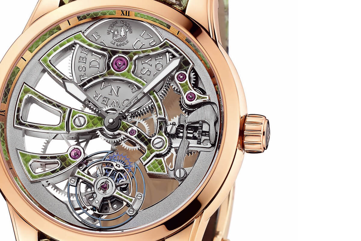 Composto por 45 componentes, o flying tourbillon está localizado às 6 horas e ostenta um revolucionário escape que desafia o princípio do escape de âncora tradicional suíço, graças a uma estrutura circular com um garfo de palete fixo no centro, apoiado no espaço por duas molas de lâmina com um diâmetro menor do que um quarto da espessura de um fio de cabelo. Montadas perpendicularmente uma à outra, as lâminas são submetidas a uma força de flexão que as curva e mantém. Trata-se de um admirável recurso técnica que garante um impulso perfeitamente uniforme na roda de balanço, independentemente da reserva de corda do relógio. Graças à tecnologia de silício também incorporada na espiral e no escape, os rubis da roda de escape tradicional tornam-se supérfluos, assim como o pivô da âncora.