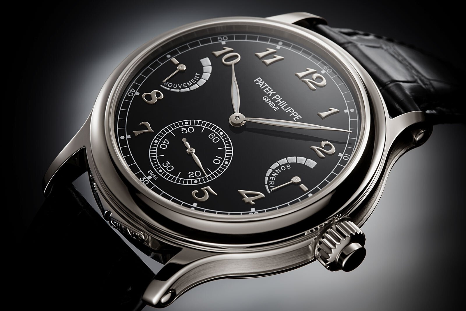 Com uma caixa em platina de 44,8 mm particularmente delgada para a complexidade que encerra, o Ref.6301P-001 Grande Sonnerie tem um mostrador preto em esmalte Grand Feu e surpreende pela aparente simplicidade e elegância. Os numerais Breguet e os ponteiros em ouro branco (preenchidos com revestimento luminescente) destacam-se contra o fundo negro esmaltado e são os elementos que mais se distinguem à primeira vista, mas depois podemos perder-nos pelos indicadores das ‘reservas de corda’, dedicadas a diferentes partes do movimento: à indicação do tempo (às 9 horas) e ao movimento acústico (às 3 horas). Nas seis horas, encontra-se o submostrador dos pequenos segundos com segundos saltantes.
